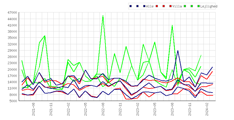 Der er 3 kurver for villaer og lejligheder, den nedre kvartil, medianen og den øvre kvartil.